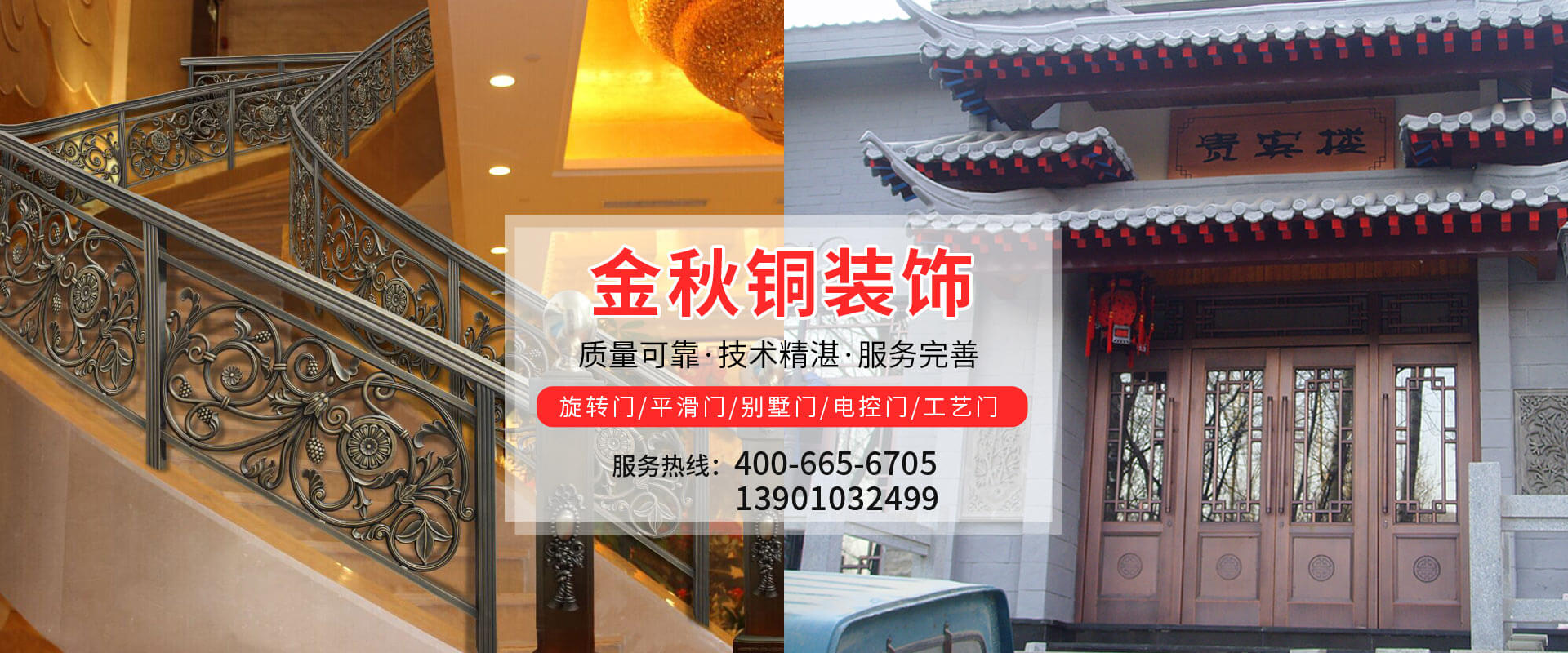 北京金秋銅裝飾材料有限公司是專業(yè)生產(chǎn)銅裝飾材料及設計、開發(fā)、制造、施工、售后服務為一體的大型綜合企業(yè)。可承接建筑銅裝飾工程及五星級酒店、別墅、博物館、樓樘管所等高檔銅裝飾項目;生產(chǎn)各種規(guī)格的旋轉門、平滑門、別墅門、電控門、工藝門、旋轉護欄、屋頂銅飾防水瓦、浮雕壁畫......